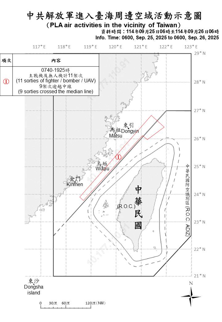 11 sorties of  PLA  aircraft , 7 PLAN ships and 1 official ship operating around Taiwan were detected as of 6 a.m. (UTC+8) today. 9 out of 11 sorties crossed the median line of the Taiwan Strait and entered Taiwan’s northern ADIZ. ROC Armed Forces have monitored the situation and employed CAP aircraft, Navy ships, and coastal missile systems in response to detected activities.