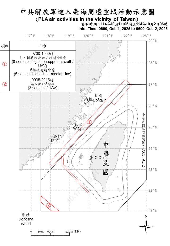 11 sorties of  PLA  aircraft, 8 PLAN ships and 2 official ships operating around Taiwan were detected as of 6 a.m. (UTC+8) today. 8 out of  11 sorties crossed the median line of the Taiwan Strait and entered Taiwan’s northern and southwestern  ADIZ. ROC Armed Forces have monitored the situation and employed CAP aircraft, Navy ships, and coastal missile systems in response to detected activities.