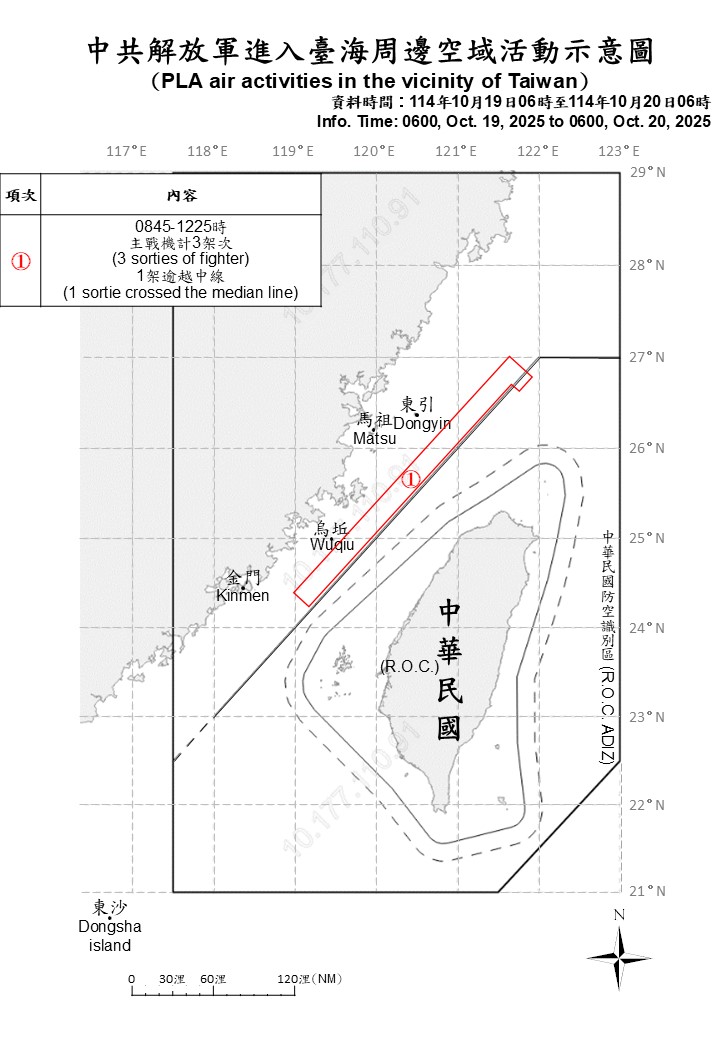 1 out of 3 sorties crossed the median line of the Taiwan Strait and entered Taiwan’s northern ADIZ. ROC Armed Forces have monitored the situation and employed CAP aircraft, Navy ships, and coastal missile systems in response to detected activities.
